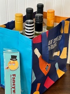 Bag of Wine chosen from our friends at Aldi.c Variety of "whites" comes in a handy reusable wine tote and a Fancywino.com MiniAir Pressure Wine Opener.