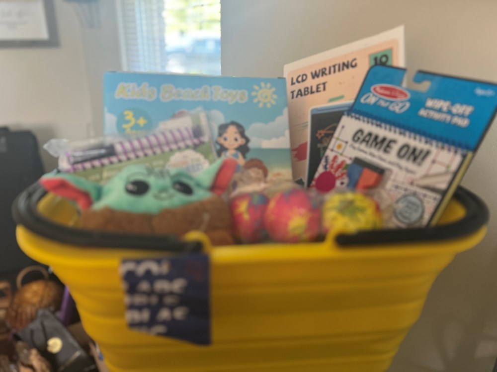 Summer is coming- and the dreaded words of "I'm bored " will be heard across the land. This collapsible bucket of goodies is a sure fire cure to boredom. Something for all ages- keep it handy at home, or throw it in the car. And you're able to keep refilling that bucket for hours more of fun. Items inclued: Collapsable Beach Toys - perfect for a suitcase. Melissa and Doug On the Go Wipe off activity pad LCD Writing Tablet Bag of splash balls- Reversable Emotion Baby Yoda Squishy "Mom I'm bored Book"