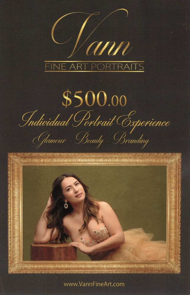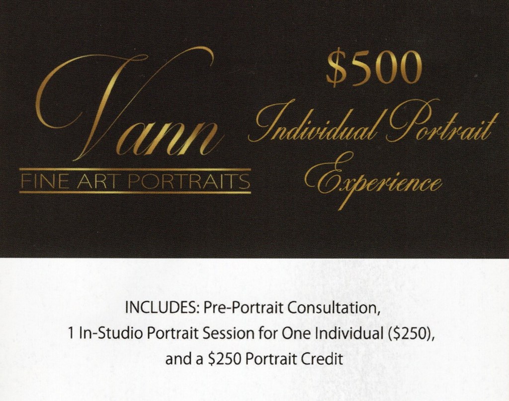 One $500.00 Gift Certificate to Vann Fine Art Portraits. This Gift Certificate includes - One Pre-Portrait Consultation, One In-Studio Portrait Session for one individual($250 value), and a $250.00 portrait credit. May be used for Glamour, Branding, or Individual 8y+ Sessions only. Expiration Date = January, 15, 2024 Restrictions: This certificate may not be re-gifted to a new party, is non-transferable, limited to one per family per year, has no cash value, cannot be combined with other offers, limit of 1 person, no pets.