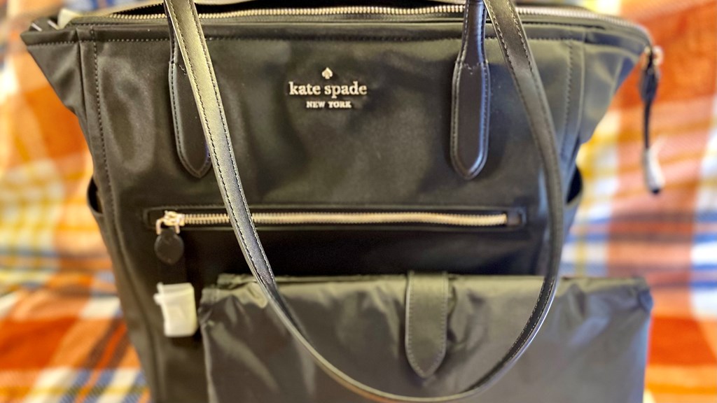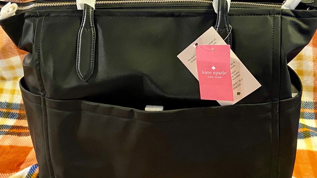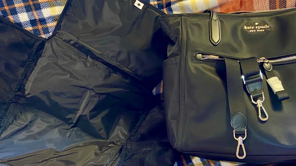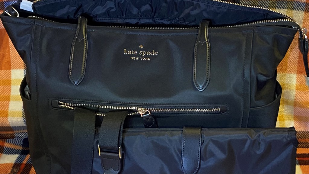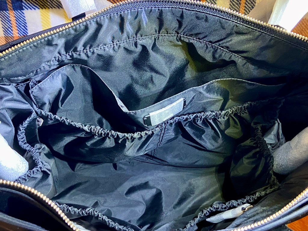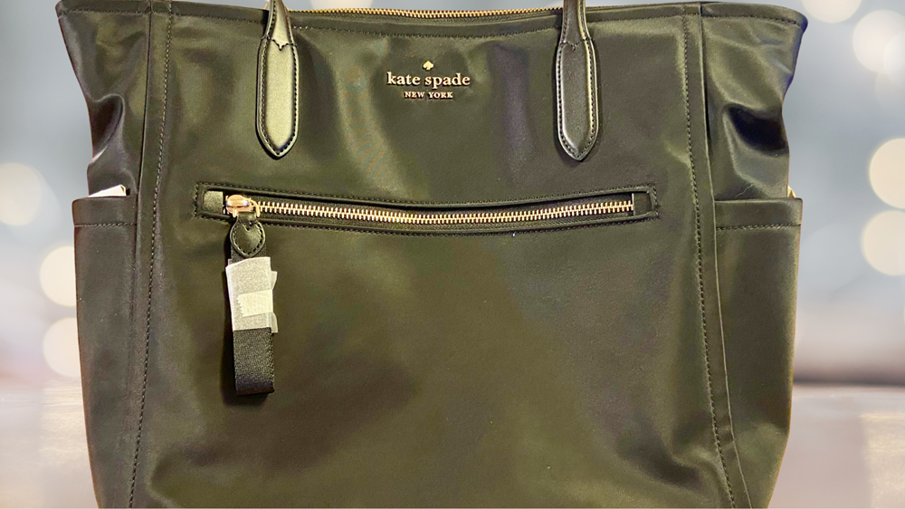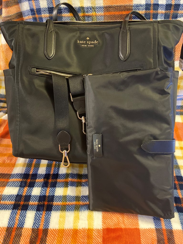 A Beautiful Baby Bag, not only would this be a fantastic tote to carry all your baby and your needs with an optional shoulder strap, so many pockets inside and out, and an included travel changing pad. This also would be a gorgeous everyday tote for anyone with a sleek look and tons of storage areas to keep you organized while never having to leave items at home. Features 12.5"H X 14"W(Bottom)/16"W(Top) X 6.5"D Handle Drop: 9" 100% Recycled Nylon Smooth Pvc Metal Pinmount 100% Recycled Polyester Lining Front Zip & Slip Pocket Back Slip Pockets & Removable Changing Pad Front Zip Pocket 2 Side Pockets & Back Zip Pocket Zip Closure