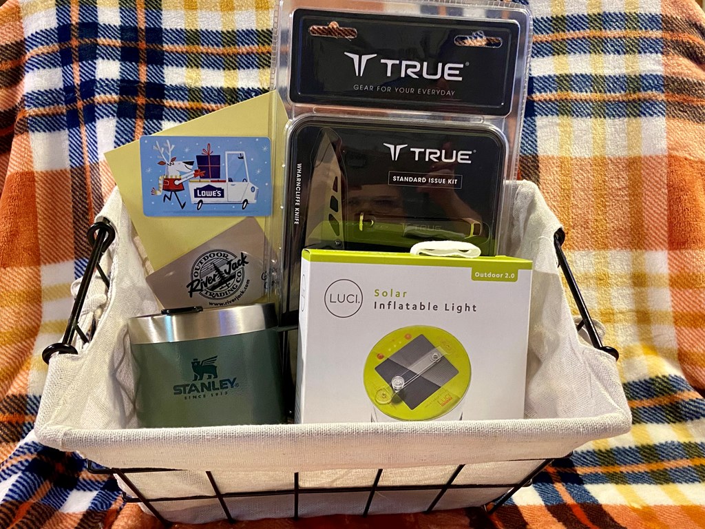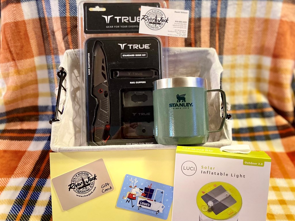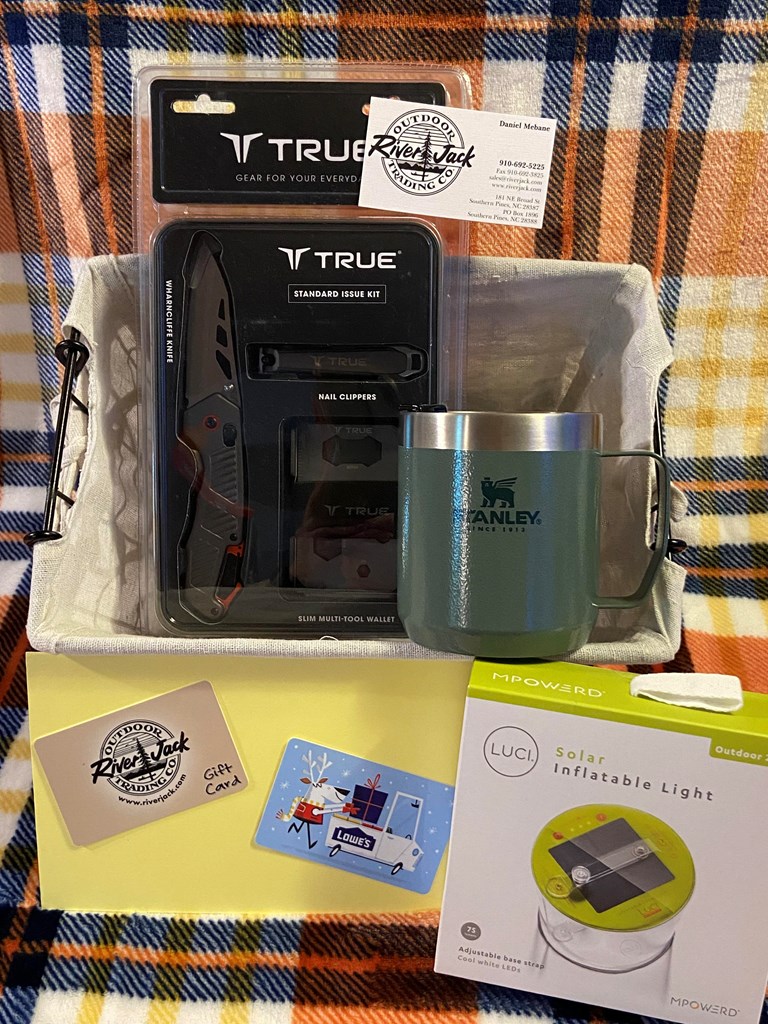 This fantastic set of items includes a $25 Gift Card to River Jack, a Logoed Stanly coffee cup with lid, a Luci Inflatable Solar Light, a TRUE Standard Issue Kit (Nail Clippers, Wharncliffe Knife, and Multi-Tool Wallet), and a $50 Lowes Gift Card. A perfect gift for yourself or a ready-made gift to share.