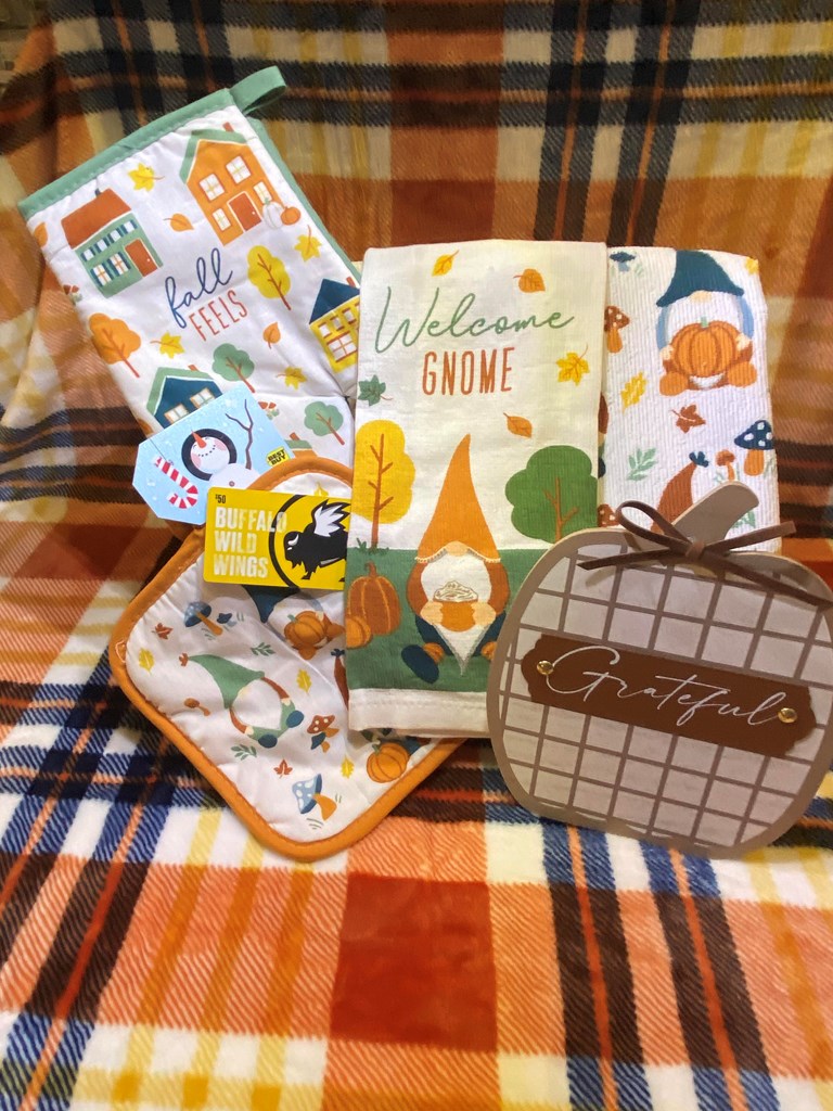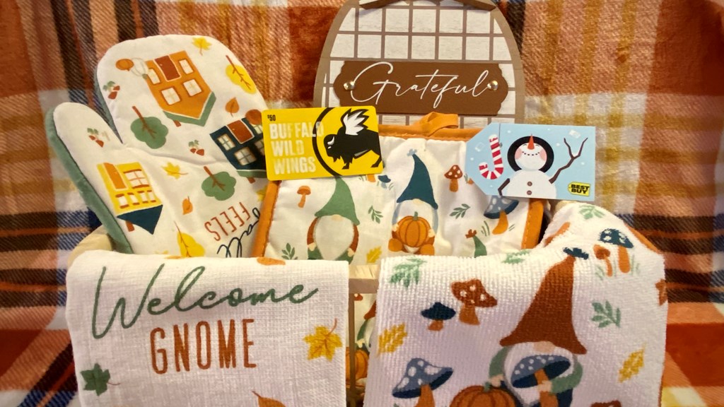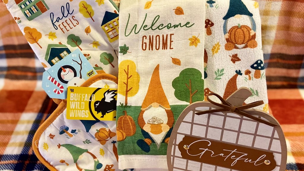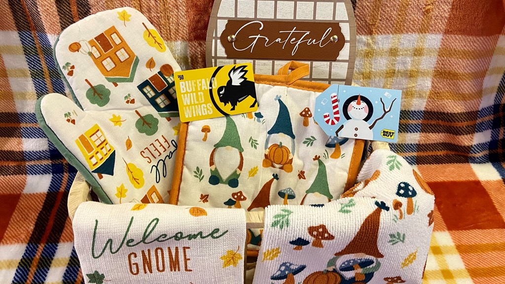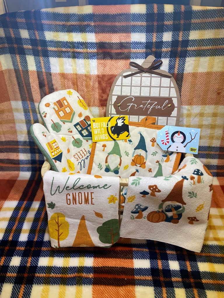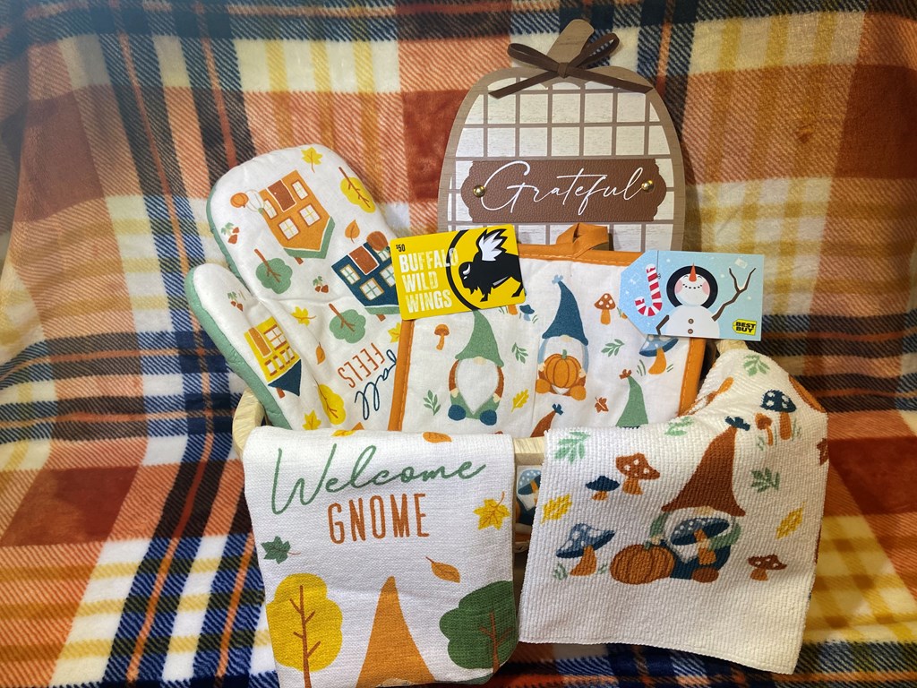 Wooden Decorative Fall Basket Includes: -Gnome Theme Set of Kitchen Towels -Oven Mitt -Decorative Pot Holder -Black & White Checkerboard Throw -Fa. Grateful Wooden Table Sign -$50 Best Buy Gift Card -$50 Buffalo Wild Wings Gift Card A Fantastic gift basket for yourself or a ready-made gift for someone else.
