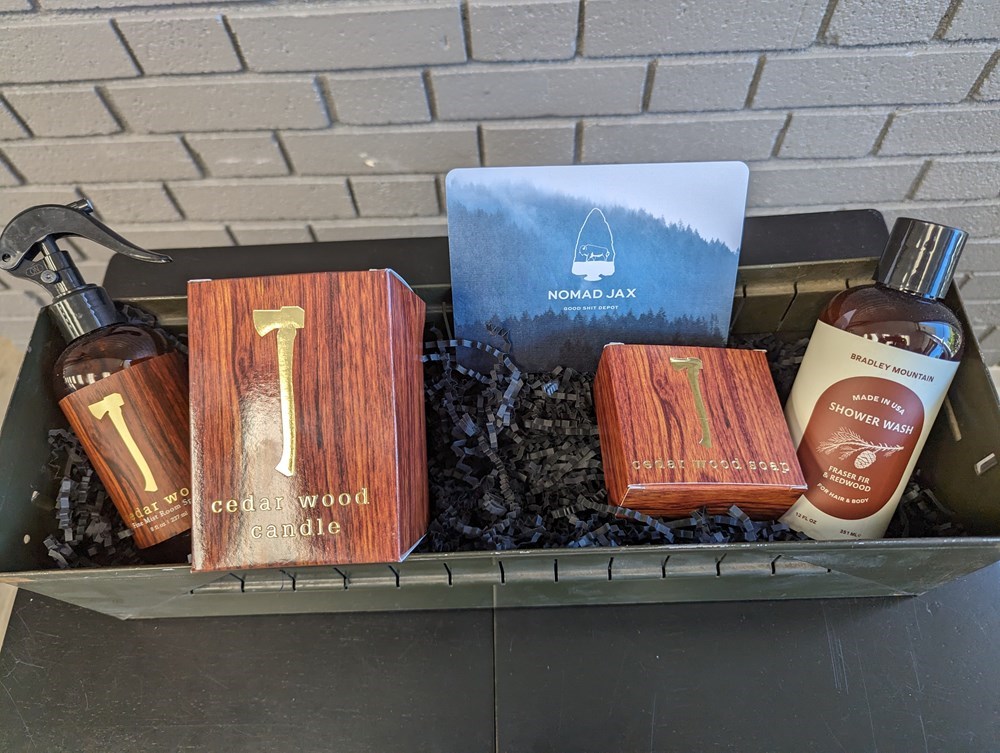 This lovely gift basket from Southern Pines's newest retail store (Nomad Jax) features a cedarwood candle and soap, cedarwood room spray, and Bradley Mountain shower wash.