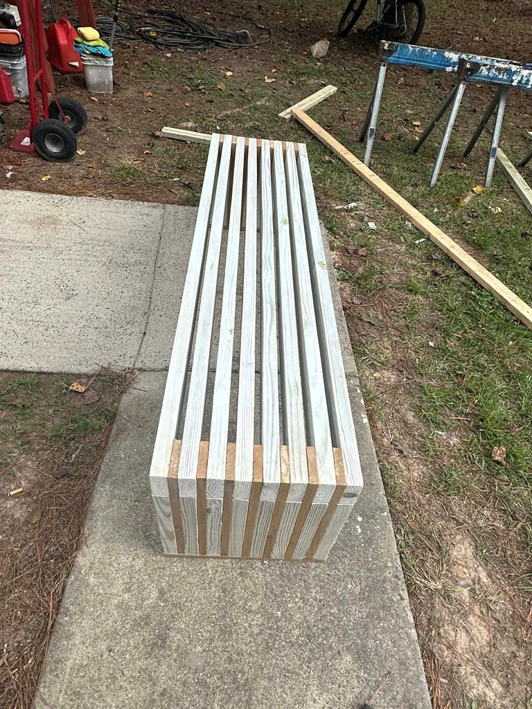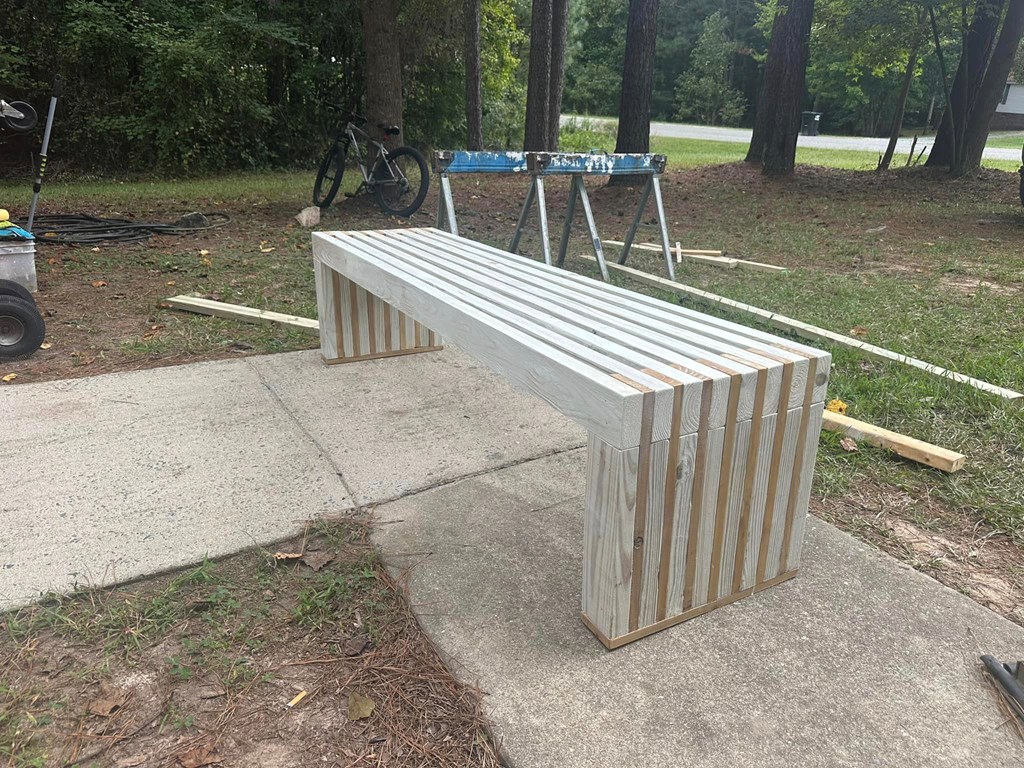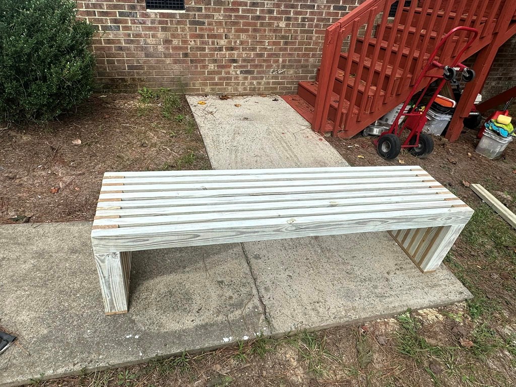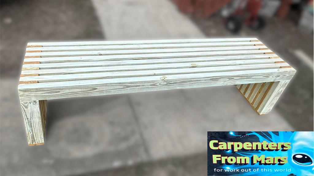 This hand-crafted outdoor bench is made of treated pine and stained to last many years in your yard or patio area. Solid construction built by Carpenter's from Mars, located in Smithfield, North Carolina. Pictures truly do not showcase the craftsmanship of this item. This is a custom-built bench, so you can enjoy having a one-of-a-kind item. The bench is 72 inches long and 18 1/2 inches tall. *This item can not be shipped and must be scheduled for local delivery or pick up. https://carpentersfrommars.com