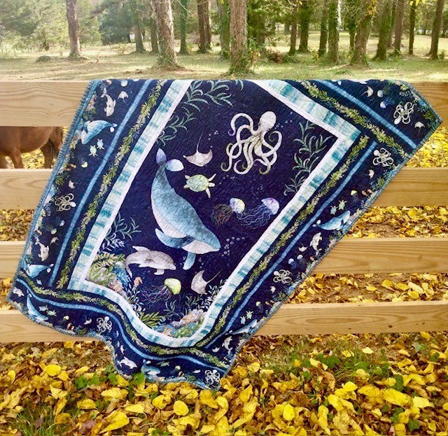 Such cool graphics on the quilt. If you love the ocean this is the one for you. Quilted with water waves and bubbles. Measures: 60" x 43" An estimated 785 million people do not have clean water—that’s nearly 1 in 10 people worldwide. Many are women and children who walk long distances to gather contaminated water for their families to drink. Access to a sanitary water source improves childhood health, education, and work opportunities for years to come. Thank you for making a difference in the lives of others today simply by bidding on a quilt!