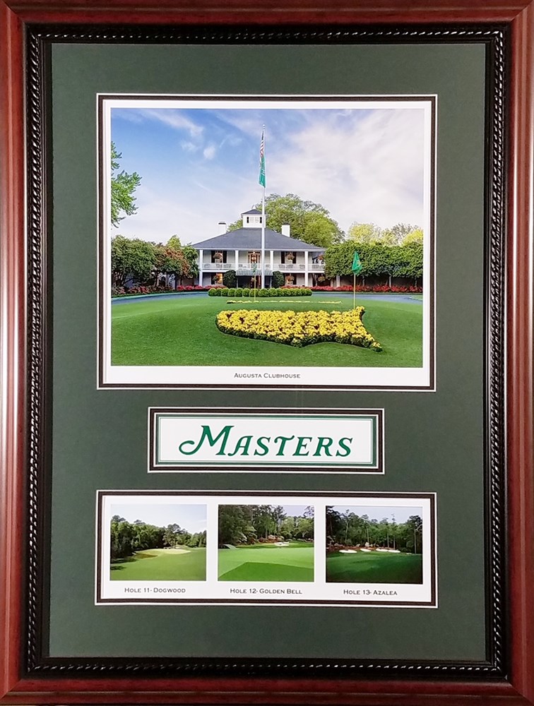 This beautifully framed piece highlights images of the Augusta National Golf Club Clubhouse that hosts the Masters Golf Tournament annually, as well as the most famous three holes on the course "Amen Corner".