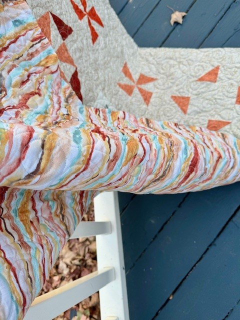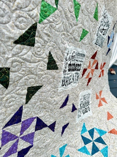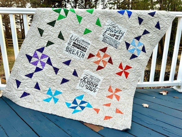 Inspiration is a happy quilt with creams, corals, purples, blues, and greens. Wonderful pinwheels, half square triangles and inspirational words make up this happy quilt. Measures: 51" x 61"