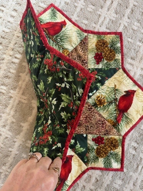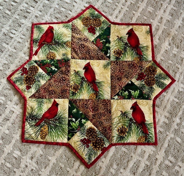 Winter Wonderland Topper is created with wonderful winter theme with lovely cardinals. Has thermal guard inside to protect for wood furniture. Measures 24" x 24"