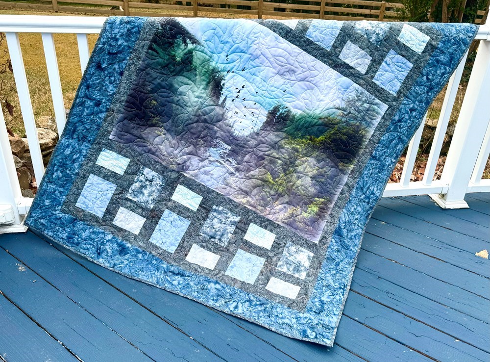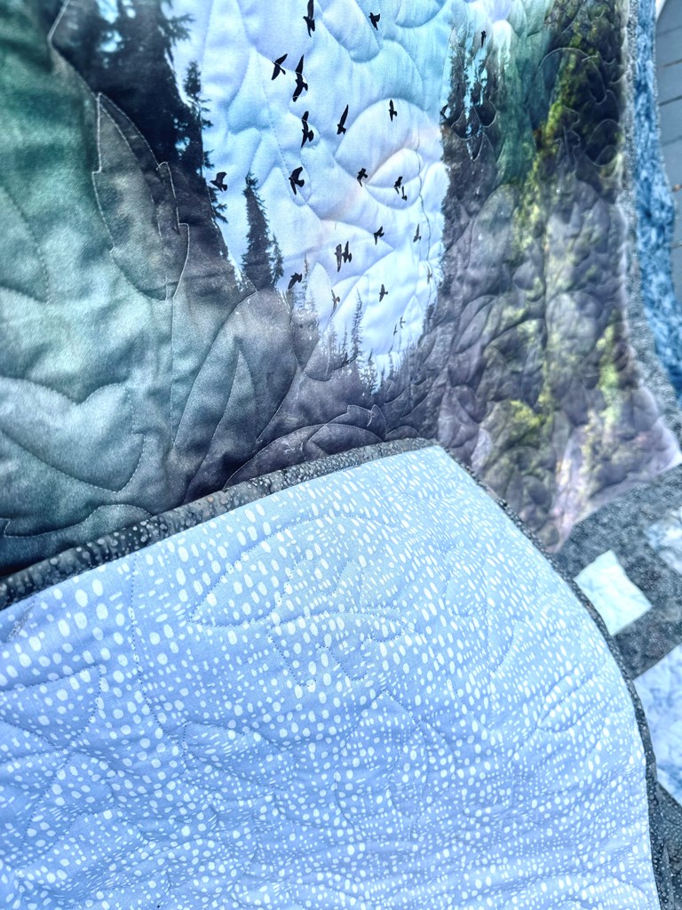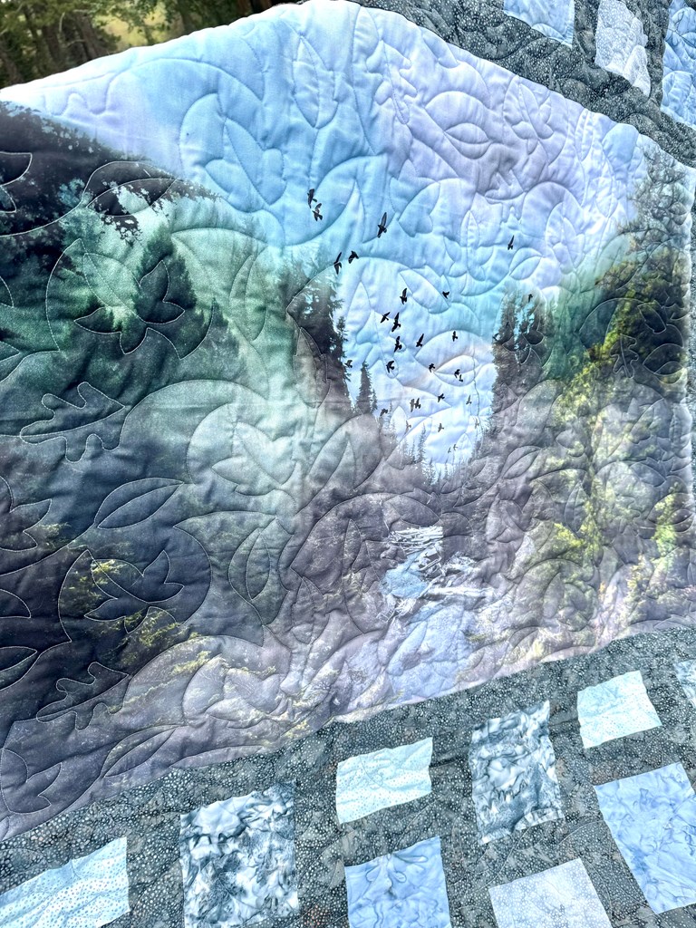The wilderness is a wonderful nature lovers quilt. Made up with blue and grey batiks and quilted with natural leaves falling. Perfect for that man in your life. Measures: 66”x 55”