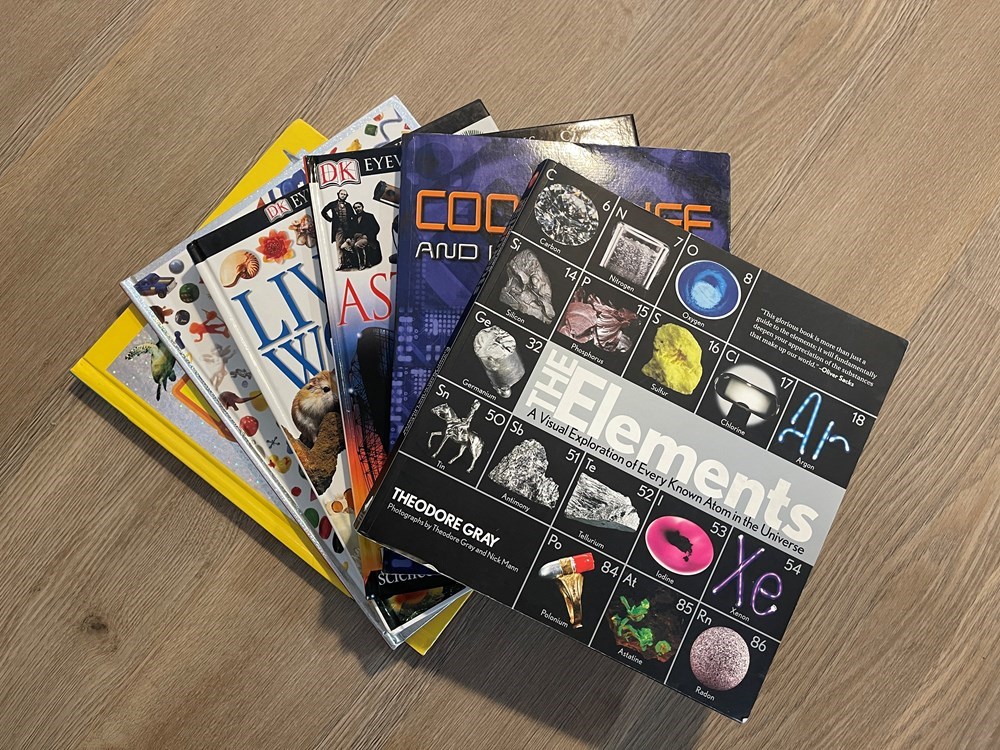 You are bidding on a set of gently used books for school age children. This would be the perfect gift for a special child in your life or for your learning environment. "The Elements: A Visual Exploration of Every Known Atom in the Universe" by Theodore Gray "Cool Stuff and How it Works" by Chris Woodford, Luke Collins, Clint Witchalls, Ben Morgan, and James Flint "Eyewitness Books: Astronomy" by Kristen Lippincott "Eyewitness Books: Living World" by Theresa Greenway, Dr. MNirabda Macquitty, Steve Parker, and Susanna Van Rose "I Spy: A Book of Picture Riddles" by Walter Wick & Jean Marzollo "National Geographic Kids: 5,000 Awesome Facts (About Everything!)" by National Geographic Pick up available in Denver Metro Area.