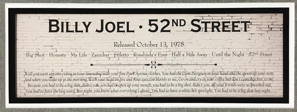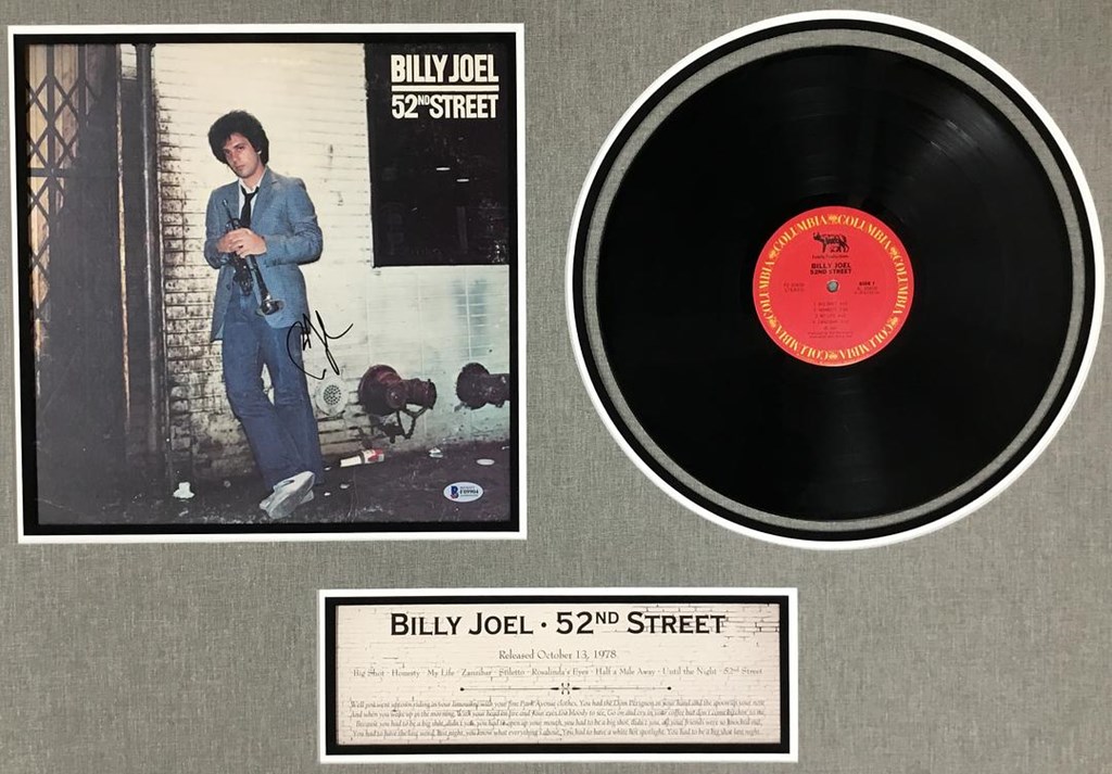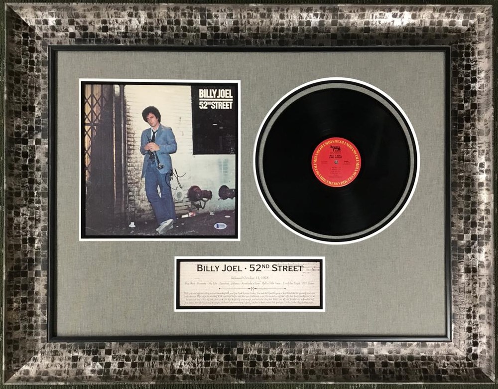 Billy Joel 52nd Street Original Record Album - October 13th, 1978 Original Album Cover Signed by Billy Joel Original Vinyl Record Custom Framed Size 30" x 38" Engraved Plaque Comes with COA from Beckett Authentication Services Newly Museum Quality Custom Framed With All Acid Free Materials Museum Standards Museum Quality Custom Framing Details: Custom Framed in a 3" mosaic frame, triple matted with gray linen outer mat and white & black suede inner mat. 100% acid free matting to museum standards. Enclosed in conservation clear glass 99% UV protection to keep the art from fading. Dust covered backed, wired ready for hanging.