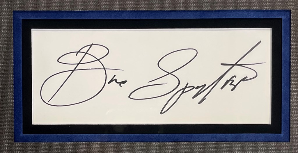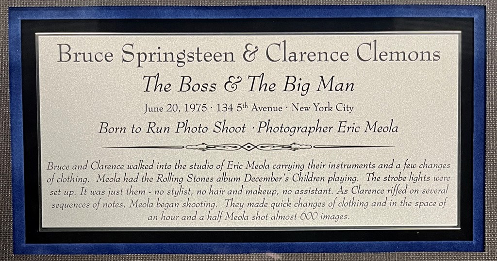 Bruce Springsteen/ Clarence Clemons Signed Cuts Custom Framed Size 29 x 23" Authenticated by JSA Featuring cut signatures of "The Boss"-Bruce Springsteen and "The Big Man"- Clarence Clemons from the famous "Born To Run" photo shoot. The signatures are authenticated by JSA- Springsteen. Museum Quality Custom Framing Details: Custom framed in 2 inch decorative black frame with blue inlay frame. Triple matted in black, blue, and grey linen. A custom engraved descriptive plaque is included. Enclosed in 99% UV museum glass to protect the signature from fading.