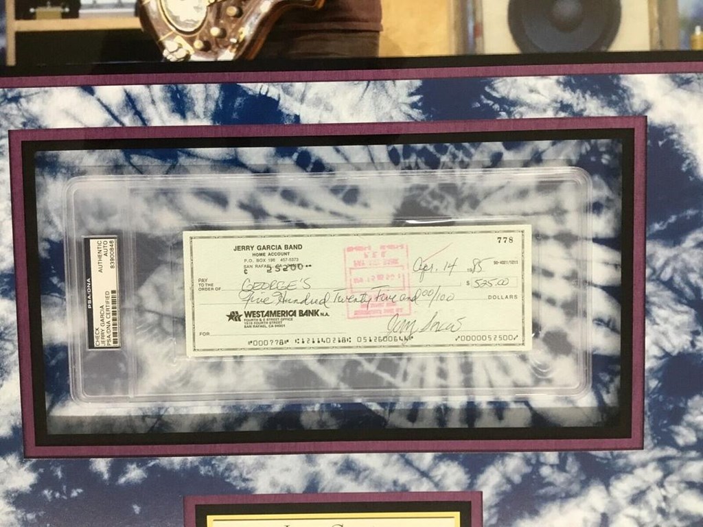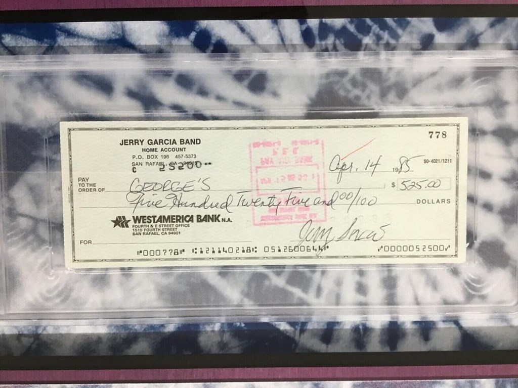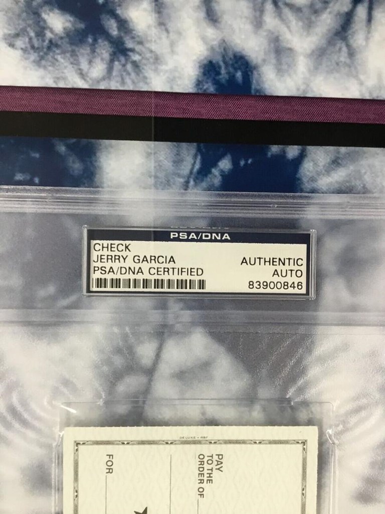 Jerry Garcia The Grateful Dead Signed check made to George's by Jerry Garcia Signed Bank Check Comes Authenticated and Slabbed by PSA/DNA Photo Size 12" x 18" Custom Framed Size 35"" x 28" Check Size 6" x 12" Newly Museum Quality Custom Framed With All Acid Free Materials Museum Standards UV Glass! Product Details: Custom framed in a 3" italian laquer black and grey tiger striped frame. LIPF tye dye outer mat, purple linen & black suede inner matting. 100% acid free matting to museum standards. Enclosed in conservation clear glass 99% UV protection to keep the art from fading. Dust covered backed, wired ready for hanging.