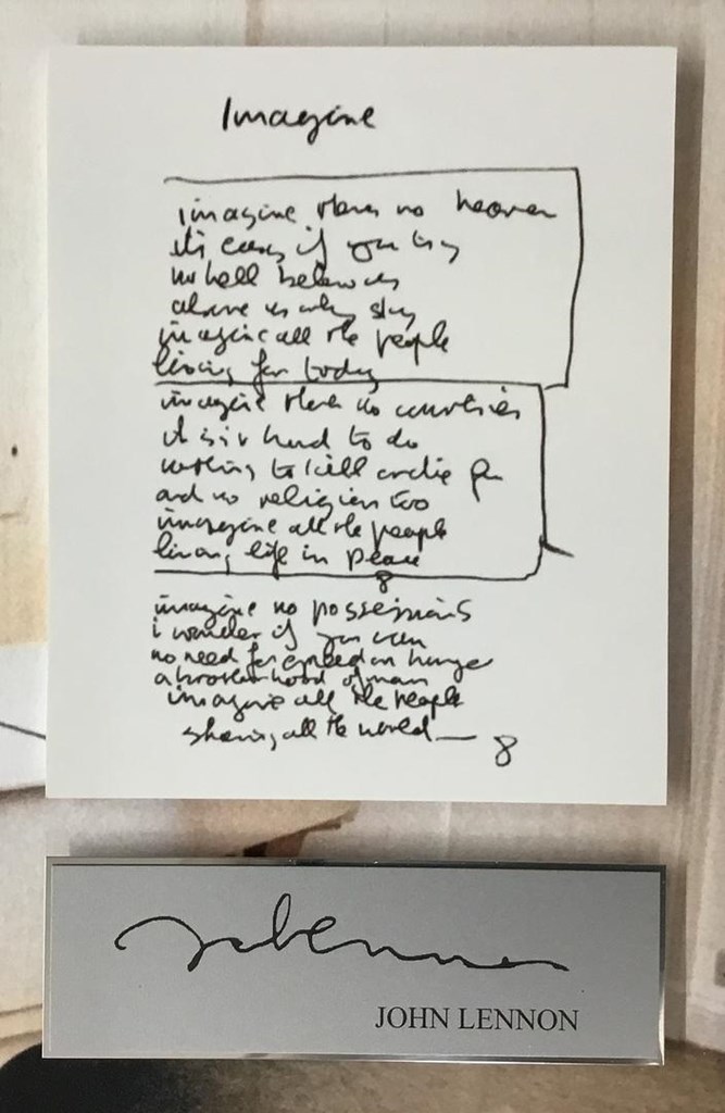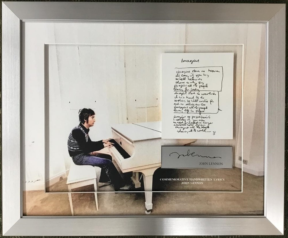 John Lennon Imagine Laser Engraved Signature Series Custom Framed Size: 19" x 23" Facsimile Lyrics Custom Framed in a 2" silver frame. Custom Photograph Backround. 100% acid free matting to museum standards. Enclosed in regular glass. Dust covered backed, wired ready for hanging.