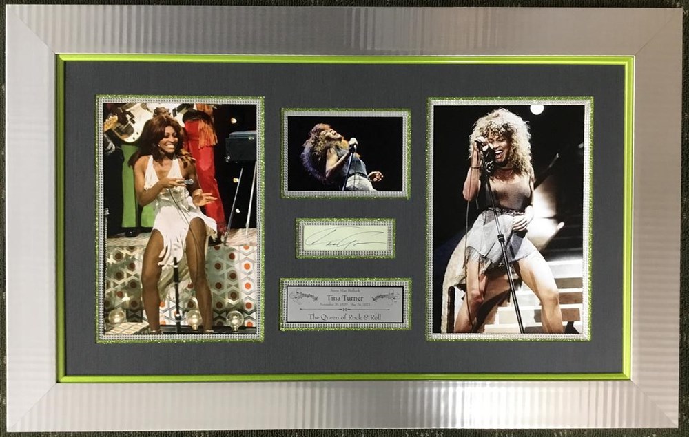 Tina Turner Signed Cut Card by Tina Turner Custom Frame Size 21" x 33" Photograph Size 10" x 8" - 4" x 6" - 10" x 8" Cut Card Size 4" x 6" Engraved Plaque Comes with Certificate of Authenticity From Beckett - QR Code Sticker AC 94837 Autograph was obtained from a Music Collection. Each Page had 2 Signatures one on the front and one on the back. The Beckett Authentication mentions both autographs. Tina Turner/Unknown Museum Quality Custom Framing Details: Custom Double Framed in a 3" silver and 3/4" lime green frame, triple matted with gray linen outer mat and lime green sparkle LIPF enhancer & silver sparkle LIPF enhancer inner matting. 100% acid free matting to museum standards. Enclosed in conservation clear glass 99% UV protection to keep the art from fading. Dust covered backed, wired ready for hanging.